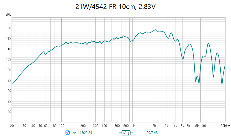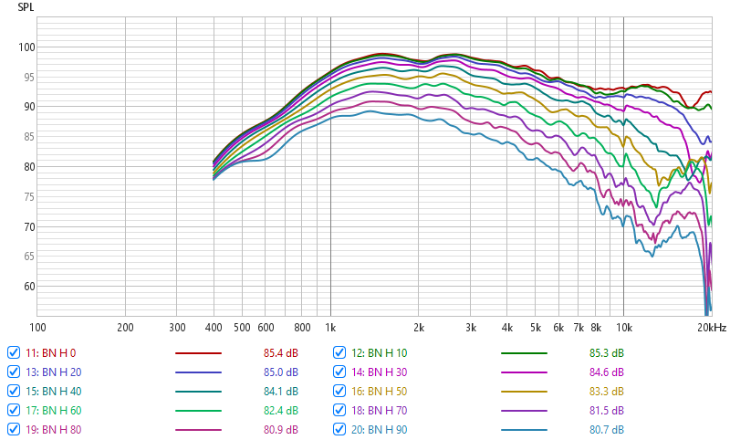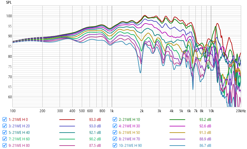 There are basically no 3rd party measurements available so I was quite curious to see the results. Datasheet curves promised linear on axis response and consistent off axis responses. Scan Speak datasheet curves often look much worse than real measurements in the baffles.