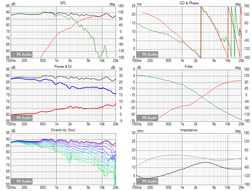 Measurements of Frequency responses were done with mic distance 1m and 2.83V. SPL was calibrated so we can see the real sensitivities. Distortion measurement was done with mic distance 10cm, and voltage 2.83V.
