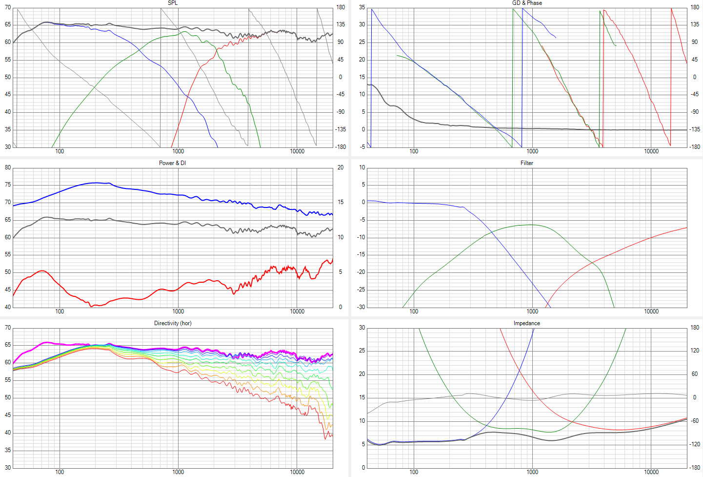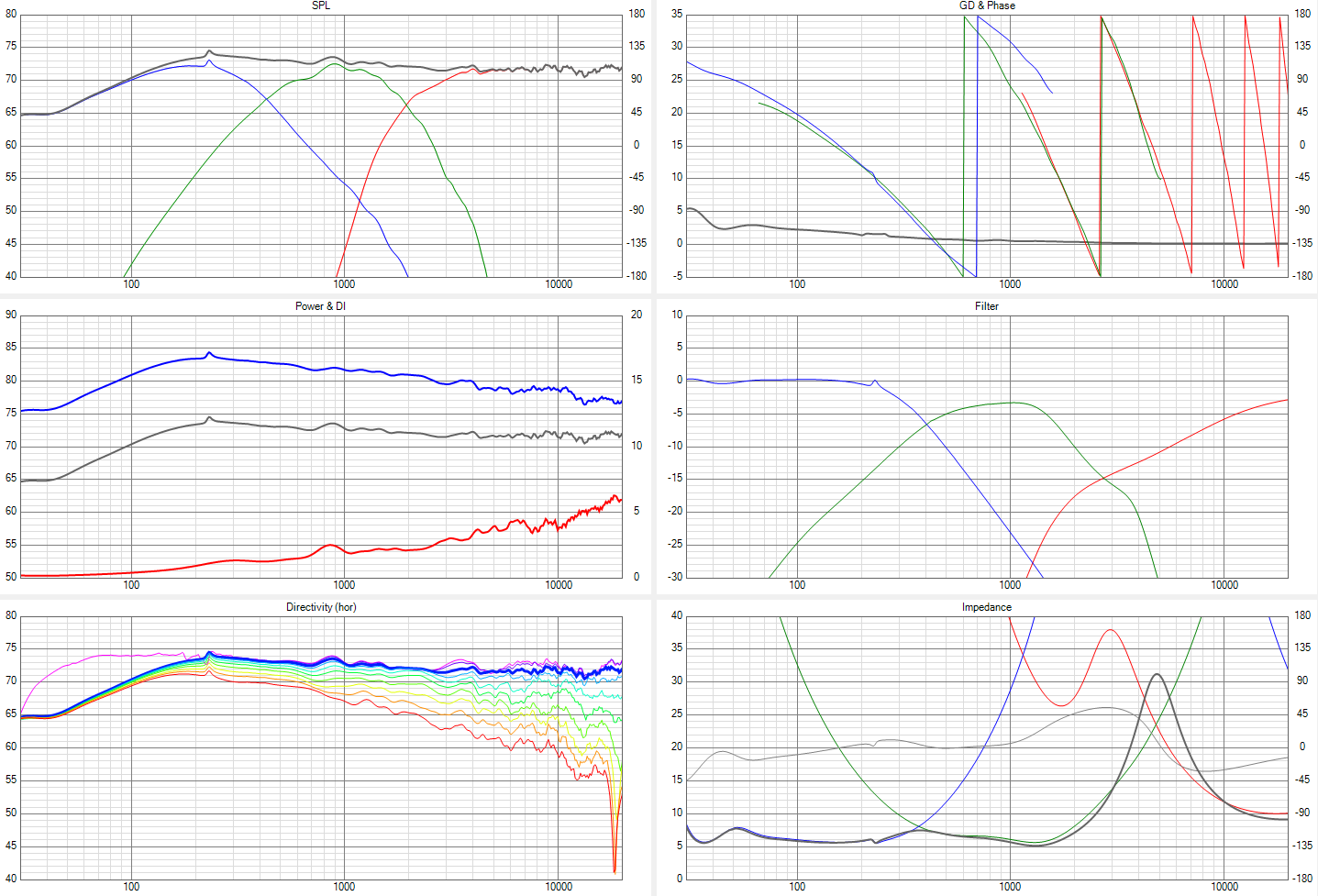 LR2 at 500Hz between woofer and mid and LR4 between mid and tweeter seems feasible. Overall, horizontal responses are nice with low dispersion, good phase matching between drivers, easy impedance for amplifier and linear power response. This looks promising and new cabinets can be made.