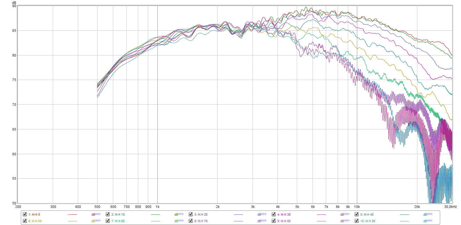 Frequency response measurements were taken with mic distance 80cm, gating 5ms was applied, no smoothing.