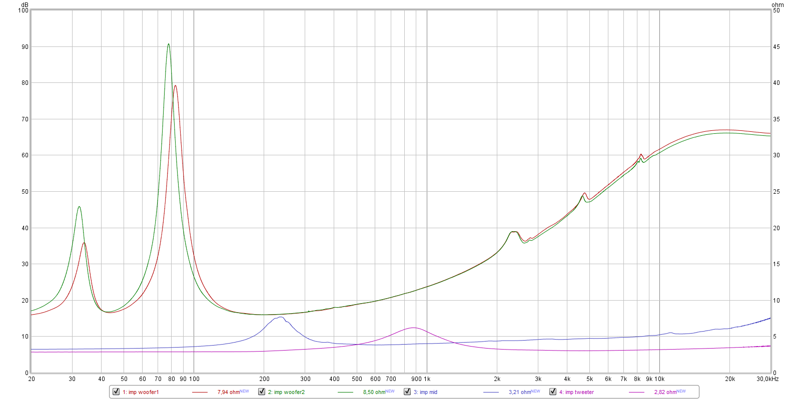 Impedance measurements of each driver are below. We can see differences of woofer tuning between left and right woofer. Tweeter impedance profile is very nice and clean, there are no issues, this is good design. Midrange impedance zoom in shows mild resonances at 2kHz and also higher.
