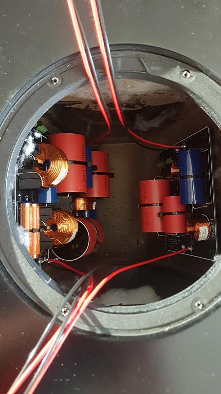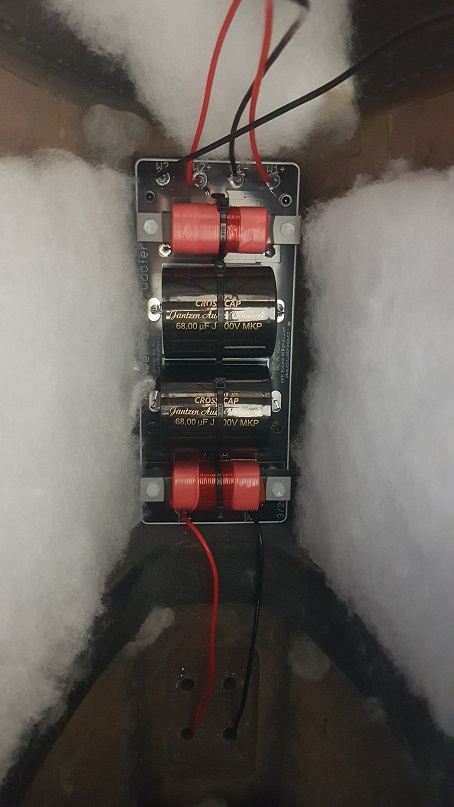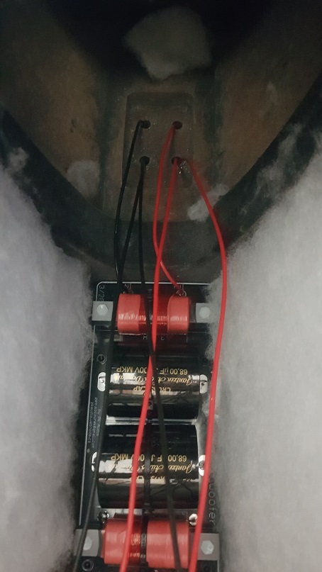 New crossover already installed in their positions and wires ready through the terminal holes. New terminals wre installed from the outside and wired ware crimped with Mundorf fastons.