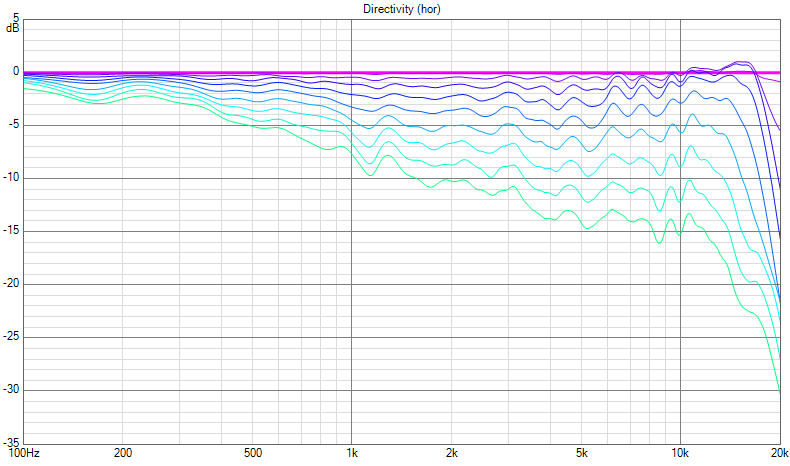 28W horizontal off-axis responses, measured from 1m GPM in room. Impulse window 9ms.