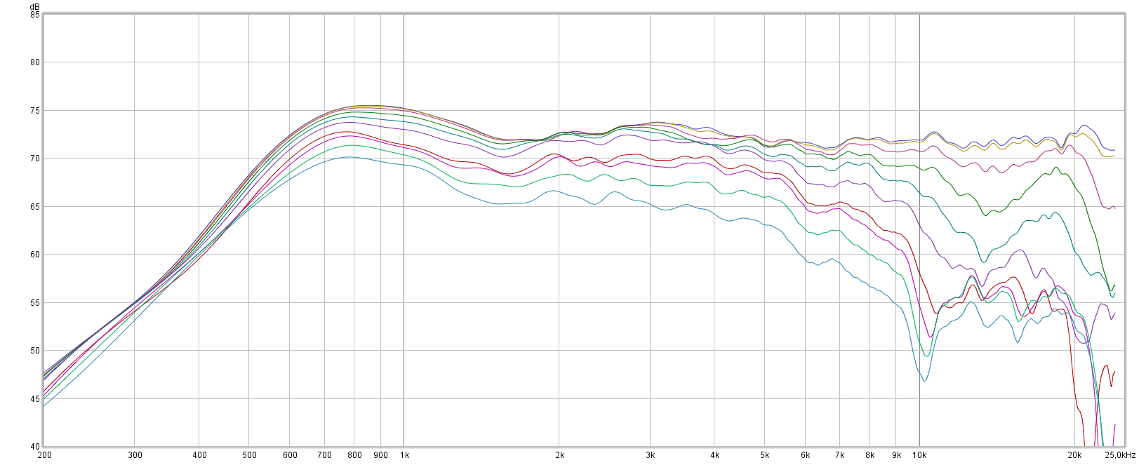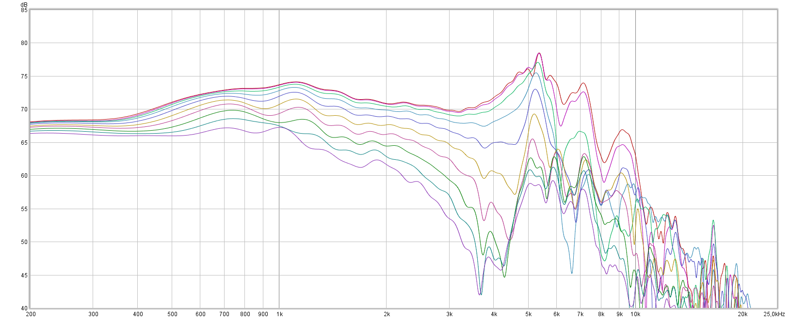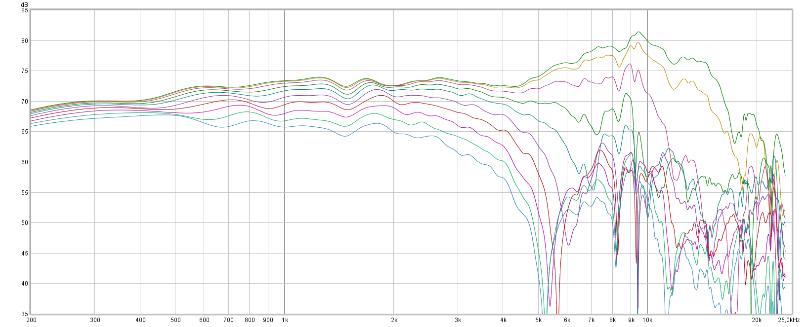 Measured horizontal responses 0-90deg are below. Mic distance 90cm, gating 4.2ms.