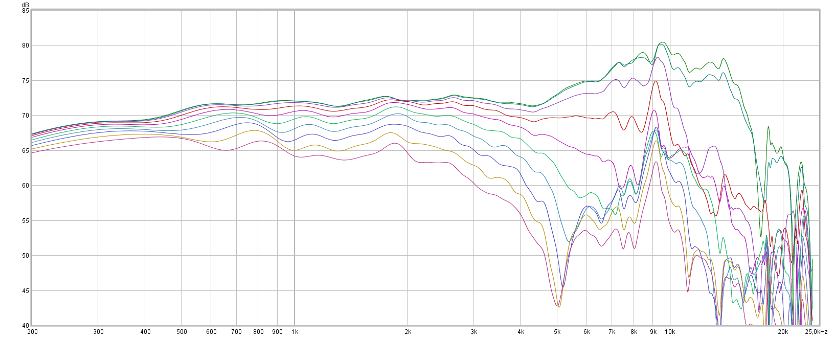 Horizontal FRs 0-90 degrees with 10degrees steps. Mic distance 90cm, impulse gating 4.5ms.
