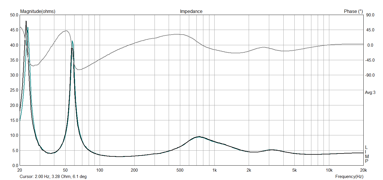 Impedance of both finished loudspeakers is below, I could not wish better match. Minimum impedance is 2.9Ohm at 170Hz.