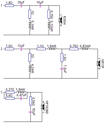 Drivers: Wavecor WF182BD09, Satori MR13P-8, Scan Speak D3004/602000 and R3004/602000Cabinet: net volume 20l for woofer, BRSensitivity: ~85dB/2.83V/1mImpedance: min 2.9Ohm at 150Hz, nominal 4Ohm