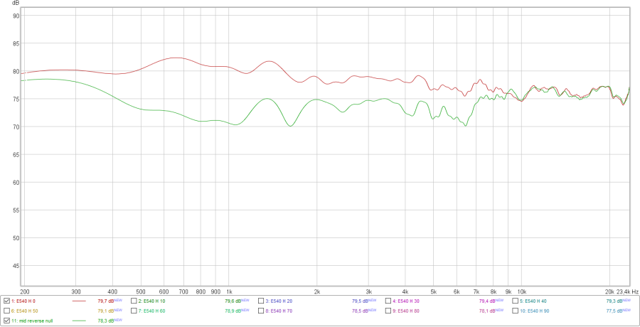 Following measurements were done with mic distance 1m, ref axis between mid and tweeter. Time window applied to impulse response ~4ms, no smoothing applied.