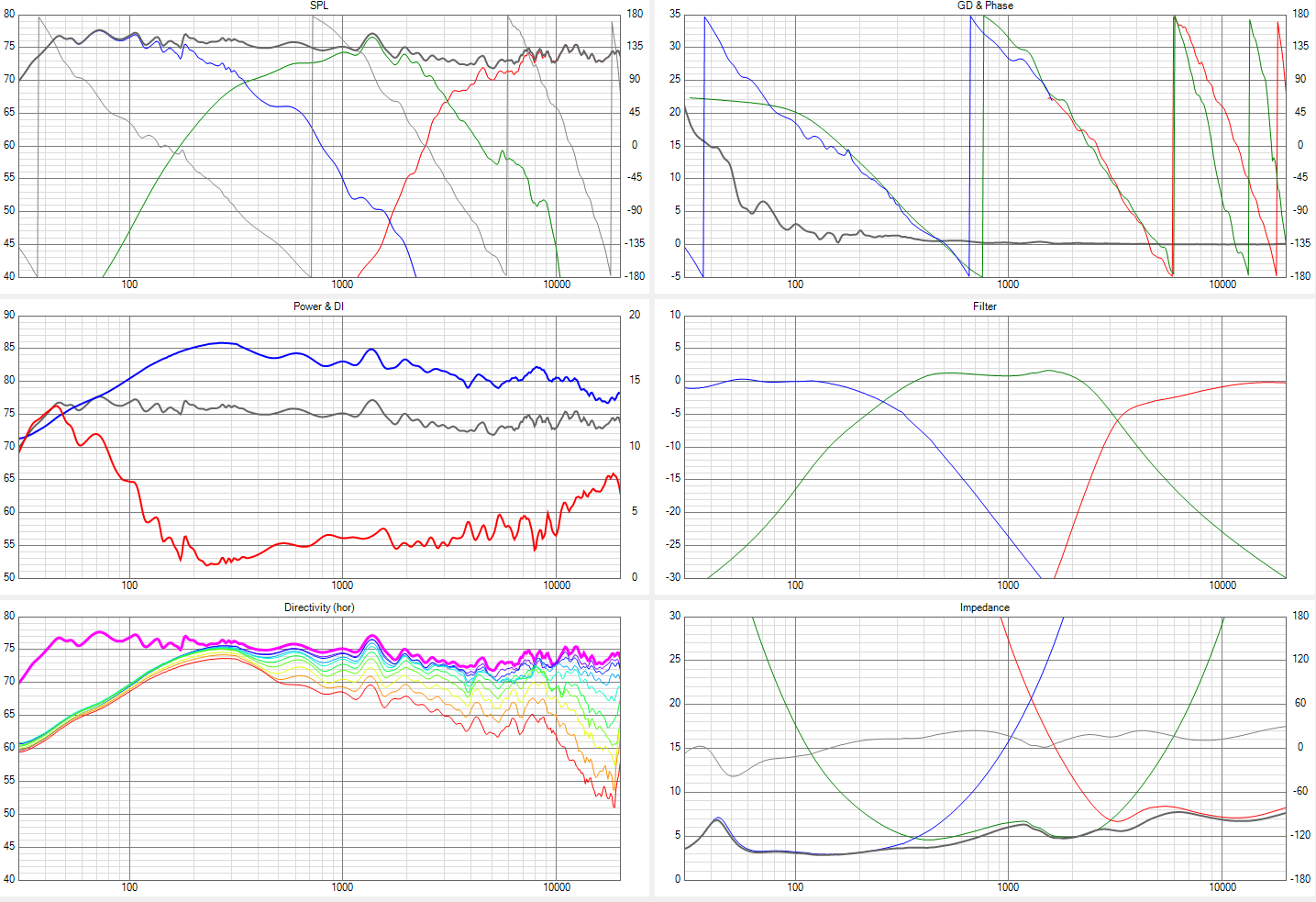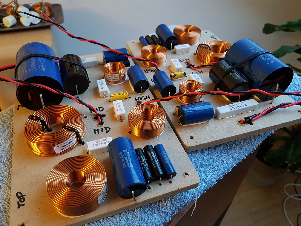 Crossover modelling was quite easy. There were troubles with impedance falling below 3Ohms, and Focal midrange had just enough sensitivity to keep up with dual Scan Speak woofers. The first version was more flat. And the sound? Not good, still quite lean bass, somehow disconnected, and certain harshness. So back to modelling and typical itteration of listening and crossover changes started. The result is bellow.
